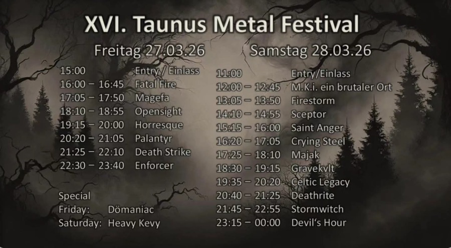 vom 27 März 15:00 Uhr - 28.03.2026 23:45 findet zum 16ten mal das Taunus Metal Festival statt.